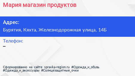 Мария, магазин продуктов по адресу Бурятия, Кяхта, Железнодорожная улица, 14Б в дальнейшем Организация, размещена в следующих категориях: