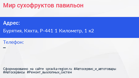 Мир сухофруктов, павильон по адресу Бурятия, Кяхта, Р-441 1 Километр, 1 к2 в дальнейшем Организация, размещена в следующих категориях: