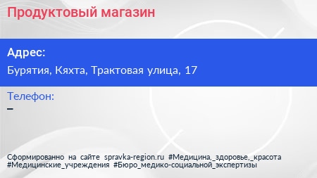 Продуктовый магазин по адресу Бурятия, Кяхта, Трактовая улица, 17 в дальнейшем Организация, размещена в следующих категориях: