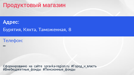 Продуктовый магазин по адресу Бурятия, Кяхта, Таможенная, 8 в дальнейшем Организация, размещена в следующих категориях:
