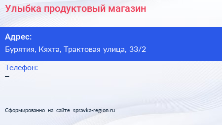 Улыбка, продуктовый магазин по адресу Бурятия, Кяхта, Трактовая улица, 33/2 в дальнейшем Организация, размещена в следующих категориях: