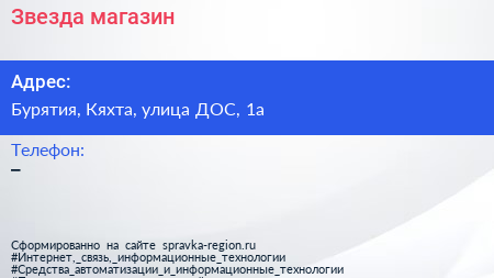 Звезда, магазин по адресу Бурятия, Кяхта, улица ДОС, 1а в дальнейшем Организация, размещена в следующих категориях: