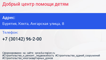 Добрый, центр помощи детям по адресу Бурятия, Кяхта, Ангарская улица, 8 в дальнейшем Организация, размещена в следующих категориях: