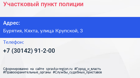 Участковый пункт полиции по адресу Бурятия, Кяхта, улица Крупской, 3 в дальнейшем Организация, размещена в следующих категориях: