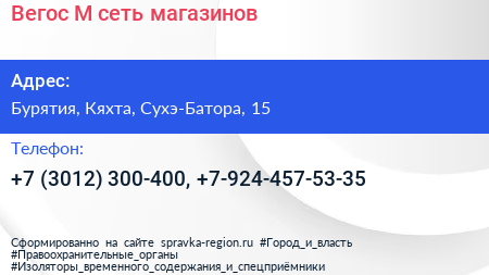 Вегос-М, сеть магазинов по адресу Бурятия, Кяхта, Сухэ-Батора, 15 в дальнейшем Организация, размещена в следующих категориях: