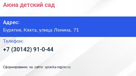 Аюна, детский сад по адресу Бурятия, Кяхта, улица Ленина, 71 в дальнейшем Организация, размещена в следующих категориях: