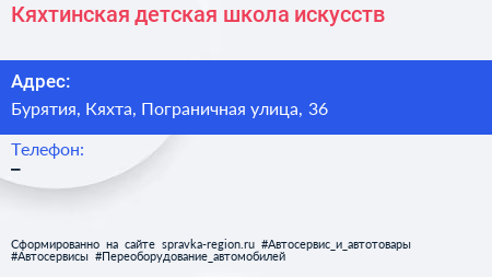 Кяхтинская детская школа искусств по адресу Бурятия, Кяхта, Пограничная улица, 36 в дальнейшем Организация, размещена в следующих категориях: