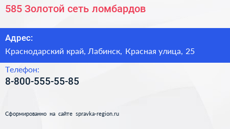 585*Золотой, сеть ломбардов по адресу Краснодарский край, Лабинск, Красная улица, 25 в дальнейшем Организация, размещена в следующих категориях:
