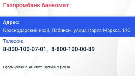 Газпромбанк, банкомат по адресу Краснодарский край, Лабинск, улица Карла Маркса, 190 в дальнейшем Организация, размещена в следующих категориях:
