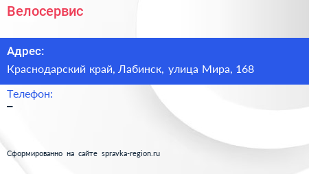 Велосервис по адресу Краснодарский край, Лабинск, улица Мира, 168 в дальнейшем Организация, размещена в следующих категориях: