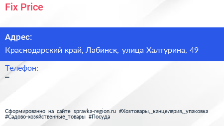 Fix Price по адресу Краснодарский край, Лабинск, улица Халтурина, 49 в дальнейшем Организация, размещена в следующих категориях: