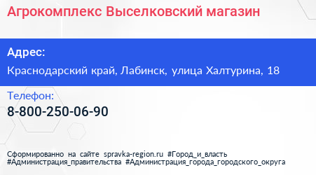 Агрокомплекс Выселковский, магазин по адресу Краснодарский край, Лабинск, улица Халтурина, 18 в дальнейшем Организация, размещена в следующих категориях: