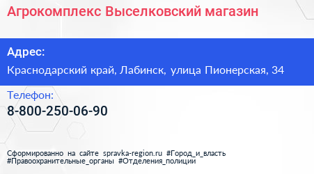 Агрокомплекс Выселковский, магазин по адресу Краснодарский край, Лабинск, улица Пионерская, 34 в дальнейшем Организация, размещена в следующих категориях: