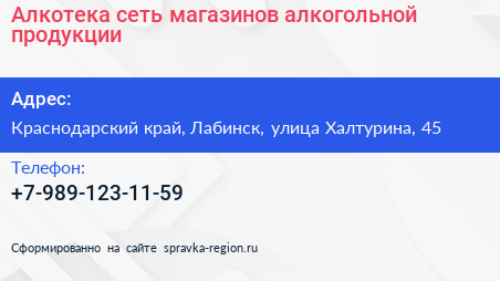 Алкотека, сеть магазинов алкогольной продукции по адресу Краснодарский край, Лабинск, улица Халтурина, 45 в дальнейшем Организация, размещена в следующих категориях: