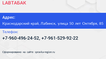 LABТАБАК по адресу Краснодарский край, Лабинск, улица 50 лет Октября, 85 в дальнейшем Организация, размещена в следующих категориях: