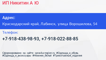 ИП Никитин А.Ю. по адресу Краснодарский край, Лабинск, улица Ворошилова, 54 в дальнейшем Организация, размещена в следующих категориях: