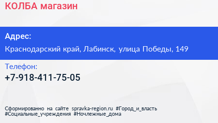 КОЛБА, магазин по адресу Краснодарский край, Лабинск, улица Победы, 149 в дальнейшем Организация, размещена в следующих категориях: