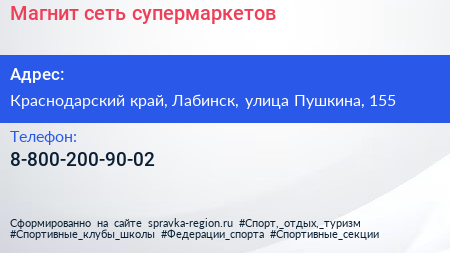 Магнит, сеть супермаркетов по адресу Краснодарский край, Лабинск, улица Пушкина, 155 в дальнейшем Организация, размещена в следующих категориях: