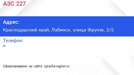 АЗС №227 по адресу Краснодарский край, Лабинск, улица Фрунзе, 2/5 в дальнейшем Организация, размещена в следующих категориях: