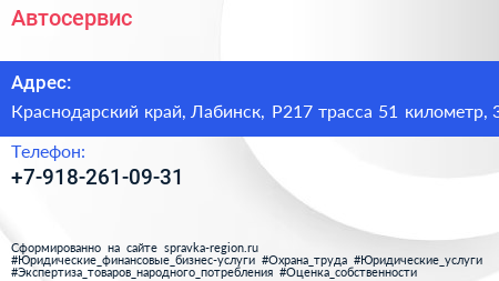 Автосервис по адресу Краснодарский край, Лабинск, Р217 трасса 51 километр, 3 в дальнейшем Организация, размещена в следующих категориях: