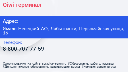 Qiwi, терминал по адресу Ямало-Ненецкий АО, Лабытнанги, Первомайская улица, 16 в дальнейшем Организация, размещена в следующих категориях: