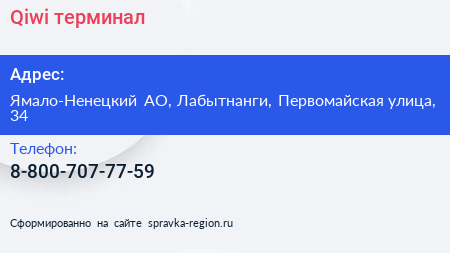 Qiwi, терминал по адресу Ямало-Ненецкий АО, Лабытнанги, Первомайская улица, 34 в дальнейшем Организация, размещена в следующих категориях: