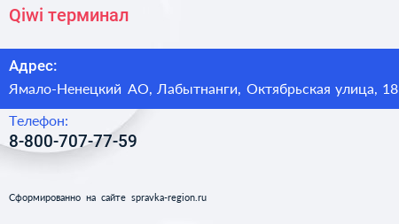 Qiwi, терминал по адресу Ямало-Ненецкий АО, Лабытнанги, Октябрьская улица, 18 в дальнейшем Организация, размещена в следующих категориях: