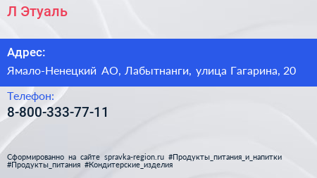 Л’Этуаль по адресу Ямало-Ненецкий АО, Лабытнанги, улица Гагарина, 20 в дальнейшем Организация, размещена в следующих категориях: