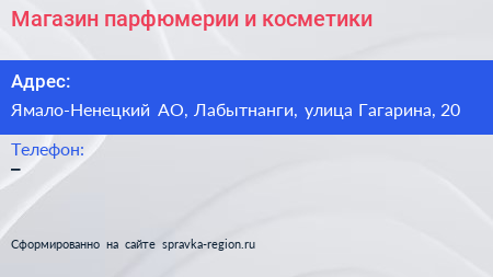 Магазин парфюмерии и косметики по адресу Ямало-Ненецкий АО, Лабытнанги, улица Гагарина, 20 в дальнейшем Организация, размещена в следующих категориях: