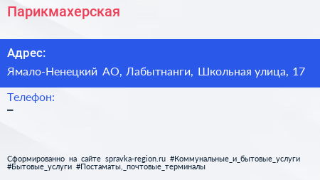 Парикмахерская по адресу Ямало-Ненецкий АО, Лабытнанги, Школьная улица, 17 в дальнейшем Организация, размещена в следующих категориях: