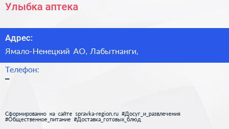 Улыбка, аптека по адресу Ямало-Ненецкий АО, Лабытнанги, в дальнейшем Организация, размещена в следующих категориях: