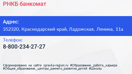 РНКБ, банкомат по адресу 352320, Краснодарский край, Ладожская, Ленина, 11а в дальнейшем Организация, размещена в следующих категориях: