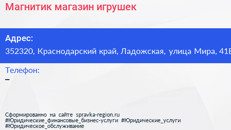 Магнитик, магазин игрушек по адресу 352320, Краснодарский край, Ладожская, улица Мира, 41Б в дальнейшем Организация, размещена в следующих категориях: