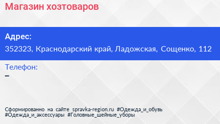 Магазин хозтоваров по адресу 352323, Краснодарский край, Ладожская, Сощенко, 112 в дальнейшем Организация, размещена в следующих категориях: