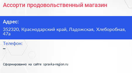 Ассорти, продовольственный магазин по адресу 352320, Краснодарский край, Ладожская, Хлеборобная, 47а в дальнейшем Организация, размещена в следующих категориях: