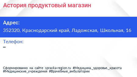 Астория, продуктовый магазин по адресу 352320, Краснодарский край, Ладожская, Школьная, 16 в дальнейшем Организация, размещена в следующих категориях: