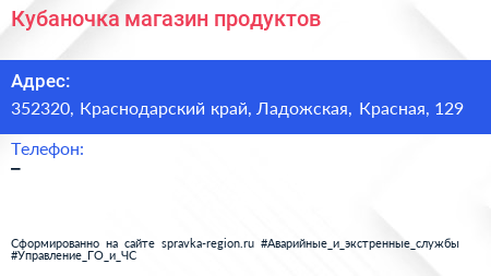 Кубаночка, магазин продуктов по адресу 352320, Краснодарский край, Ладожская, Красная, 129 в дальнейшем Организация, размещена в следующих категориях: