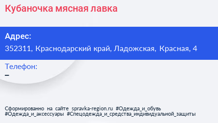 Кубаночка, мясная лавка по адресу 352311, Краснодарский край, Ладожская, Красная, 4 в дальнейшем Организация, размещена в следующих категориях: