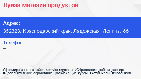 Луиза, магазин продуктов по адресу 352323, Краснодарский край, Ладожская, Ленина, 66 в дальнейшем Организация, размещена в следующих категориях: