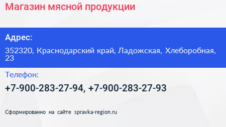 Магазин мясной продукции по адресу 352320, Краснодарский край, Ладожская, Хлеборобная, 23 в дальнейшем Организация, размещена в следующих категориях: