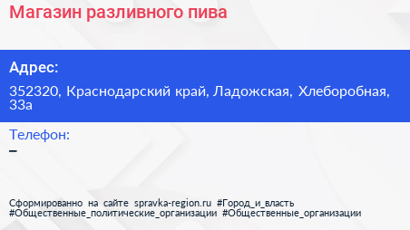 Магазин разливного пива по адресу 352320, Краснодарский край, Ладожская, Хлеборобная, 33а в дальнейшем Организация, размещена в следующих категориях:
