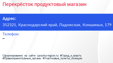 Перекрёсток, продуктовый магазин по адресу 352321, Краснодарский край, Ладожская, Коншиных, 179 в дальнейшем Организация, размещена в следующих категориях:
