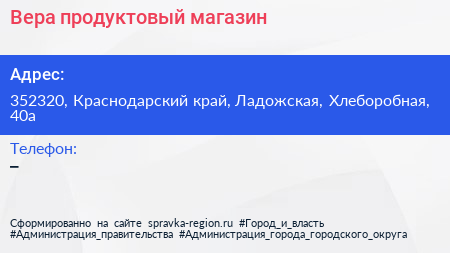 Вера, продуктовый магазин по адресу 352320, Краснодарский край, Ладожская, Хлеборобная, 40а в дальнейшем Организация, размещена в следующих категориях: