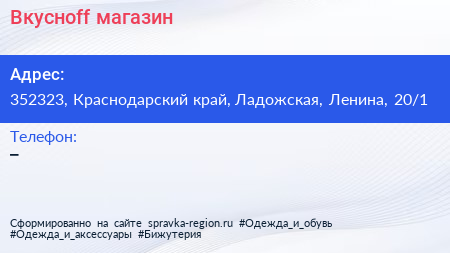 Вкусноff, магазин по адресу 352323, Краснодарский край, Ладожская, Ленина, 20/1 в дальнейшем Организация, размещена в следующих категориях:
