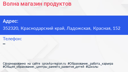 Волна, магазин продуктов по адресу 352320, Краснодарский край, Ладожская, Красная, 152 в дальнейшем Организация, размещена в следующих категориях:
