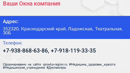 Ваши Окна, компания по адресу 352320, Краснодарский край, Ладожская, Театральная, 30Б в дальнейшем Организация, размещена в следующих категориях: