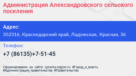 Администрация Александровского сельского поселения по адресу 352316, Краснодарский край, Ладожская, Красная, 36 в дальнейшем Организация, размещена в следующих категориях: