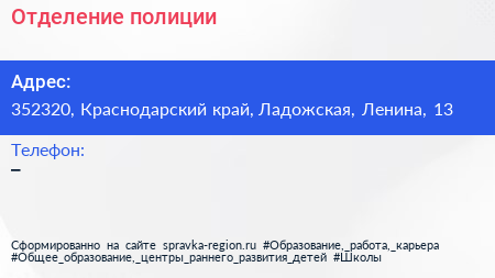 Отделение полиции по адресу 352320, Краснодарский край, Ладожская, Ленина, 13 в дальнейшем Организация, размещена в следующих категориях: