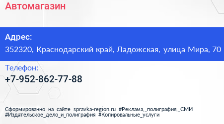 Автомагазин по адресу 352320, Краснодарский край, Ладожская, улица Мира, 70 в дальнейшем Организация, размещена в следующих категориях:
