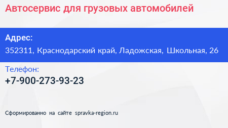 Автосервис для грузовых автомобилей по адресу 352311, Краснодарский край, Ладожская, Школьная, 26 в дальнейшем Организация, размещена в следующих категориях: